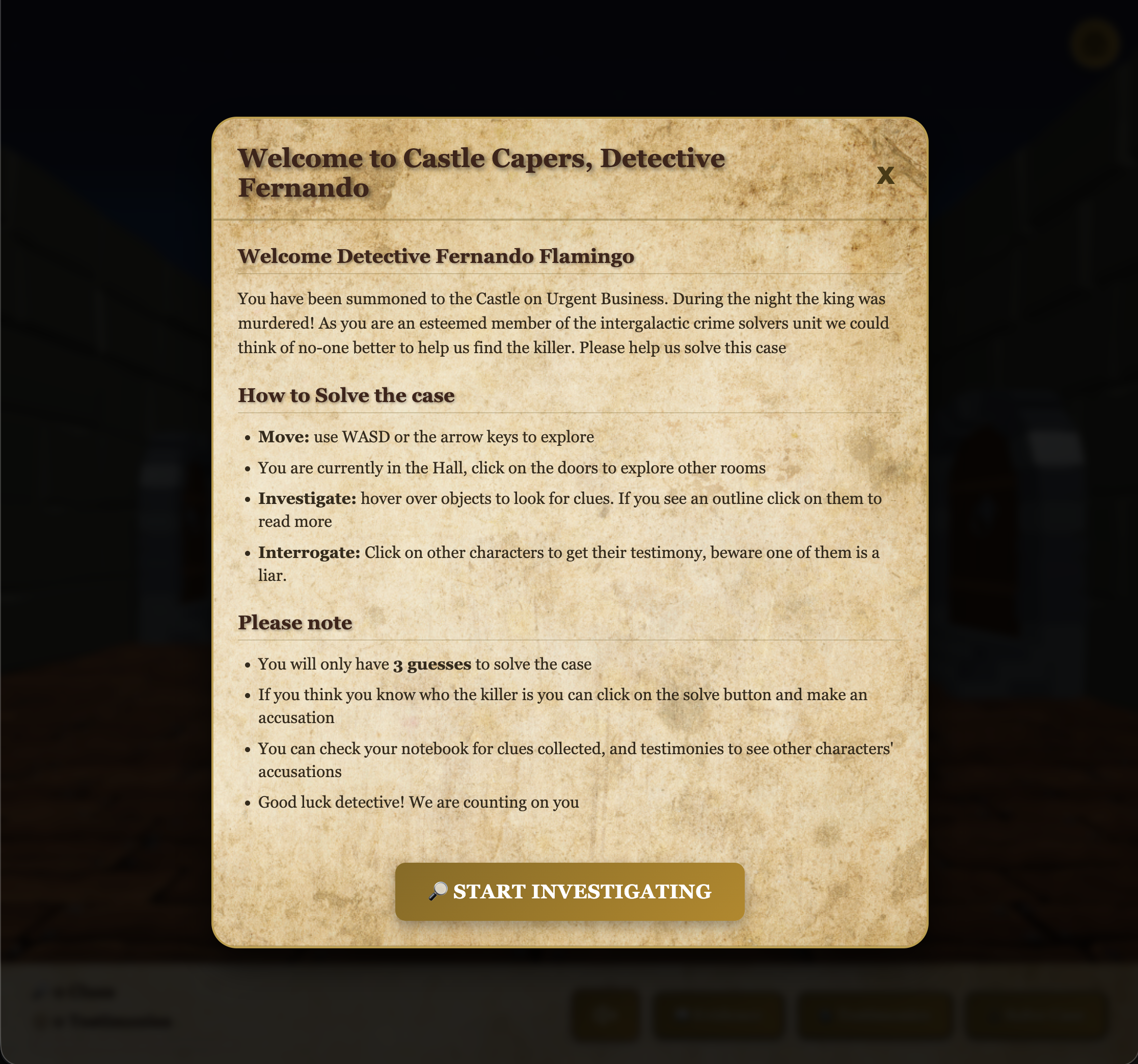A mini 3D murder mystery game — explore a castle, find clues, and figure out whodunit.